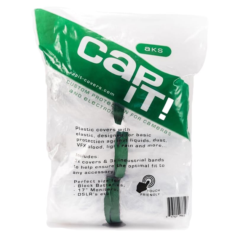 - The Cap It! Cover (AKS) is a thin, pull-over protective sleeve sized for a range of smaller setups and accessories, from DSLR rigs and small camera builds to monitors, block batteries, kit bags, and slates. It leaves room for attached cabling and small add-ons, and its lightweight film keeps touchscreens usable. You slip it over the item, secure it with the supplied rubber band, trim where needed, and carry on shooting with the kit shielded from rain, dust, and debris.