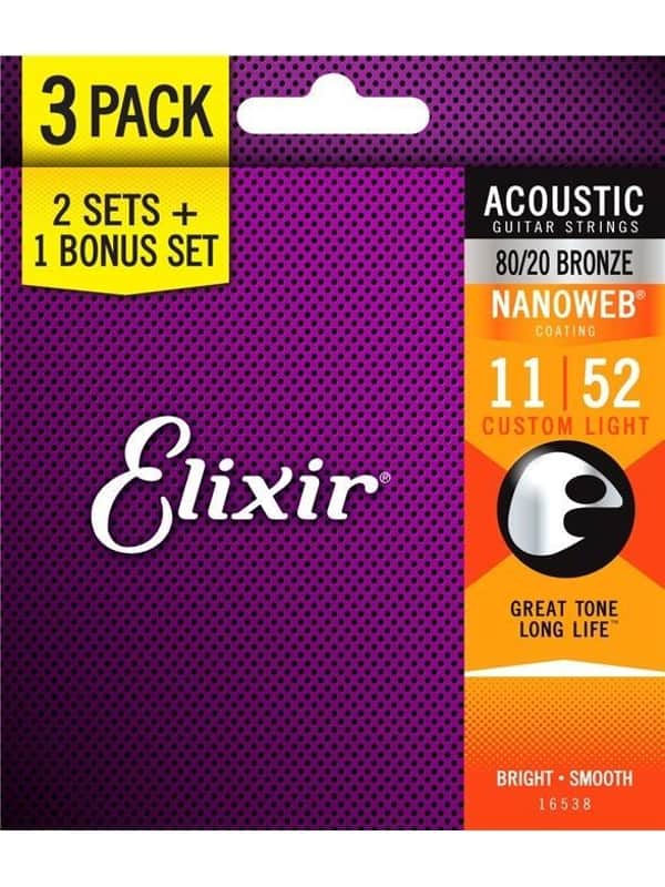 - Bonus pack Elixir coated bronze light guage acoustic guitar strings. .011-.052. 3 sets of strings for the price of 2.