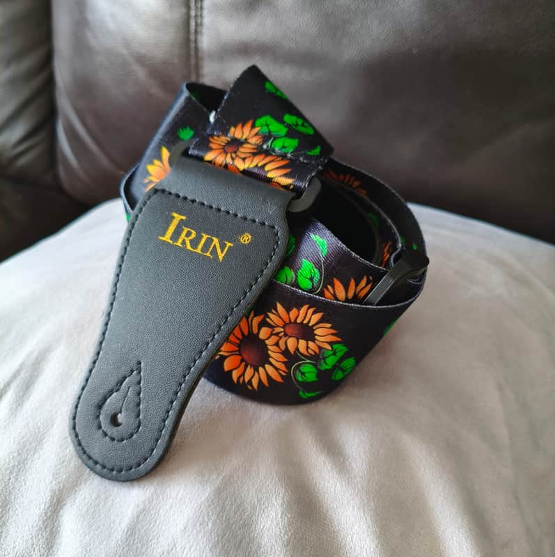 - Sunflower patterned guitar strap with vegan leather ends , lovely fabric finish.