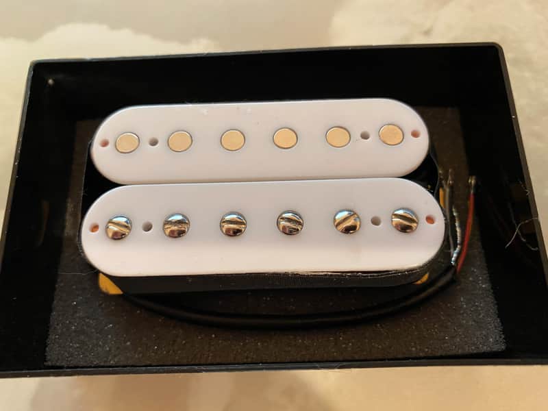 - Maydevale UFO humbucker pickup in white, bridge (trem spaced) position.DCR circa 10.5kRoughcast Alnico V (unoriented)52mm spacing4 conductor wiring...
