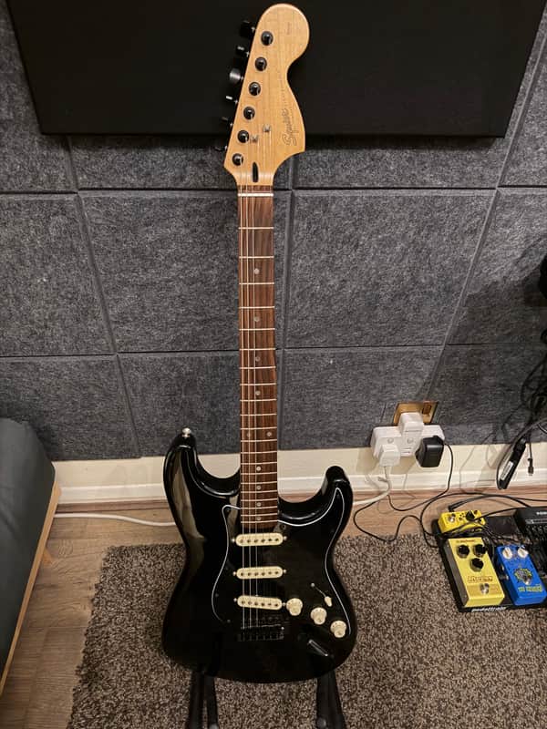 - This is a great example of a custom made squire Stratocaster with black hardware.The pickups and scratch plate are Fender Tex mex loaded, so they s...