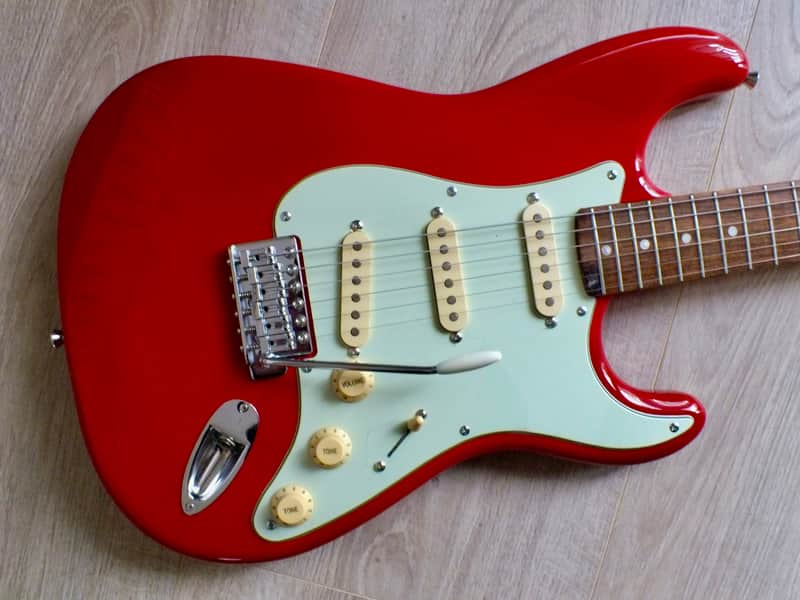 - RED FENDER SQUIER STRATOCASTER Affinity in Red with Mint Green 3 ply Plastics and Cream Pickup Covers &
