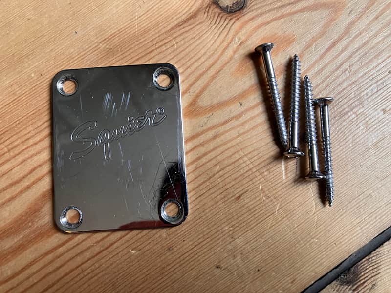- Squier neckplate with screws. From a 2011 Indonesian made Vintage Modified Jazz Bass.Pre owned. Mounting screws included.Used condition, scratches ...