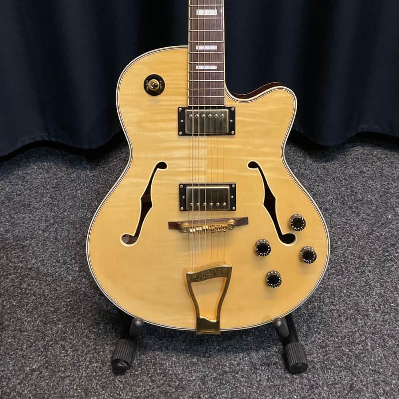 - Preowned Stagg A300 hollow body electric guitar in very good condition. Laminated Flame Maple top, and Mahogany back and sides in natural gloss fi...