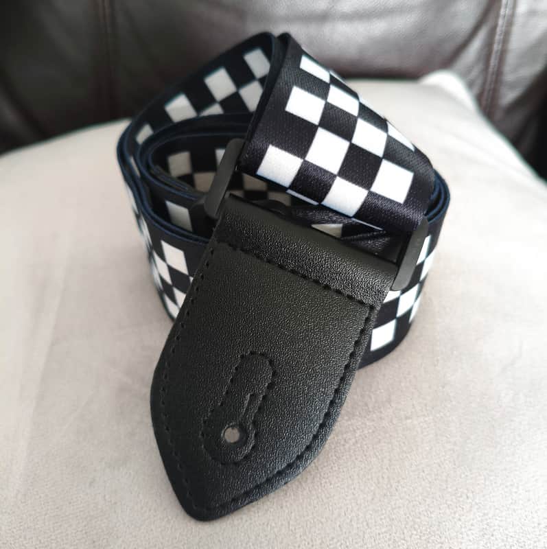 - Checkerboard guitar strap with vegan leather ends , lovely fabric finish.