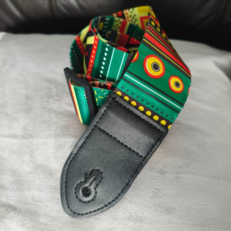 - Funky patterned guitar strap with vegan leather ends , lovely fabric finish.